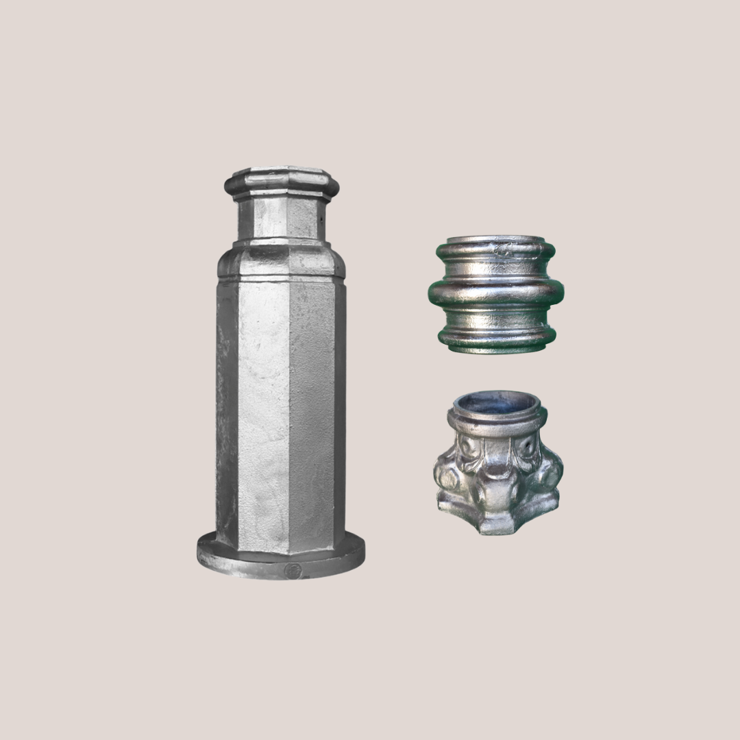 Accesorios para armado de columnas para techos, aleros, galerías, pérgolas o iluminación. Apto para caño de acero estructural de 2,5” de diámetro exterior.